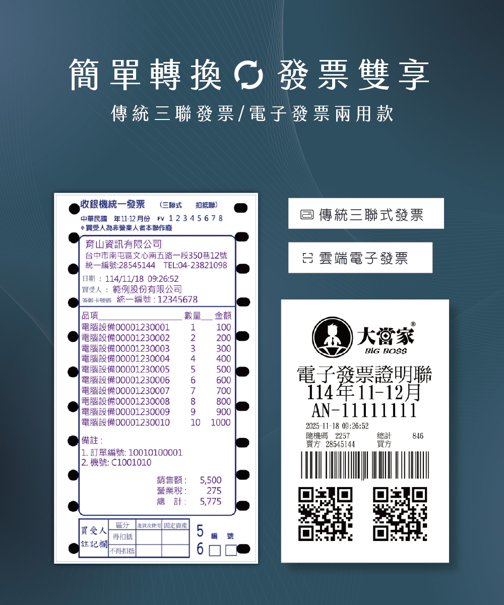 ◆ 傳統長條式二聯發票/電子發票兩用款,購買一台日後可轉換電子發票使用,不須額外購機。