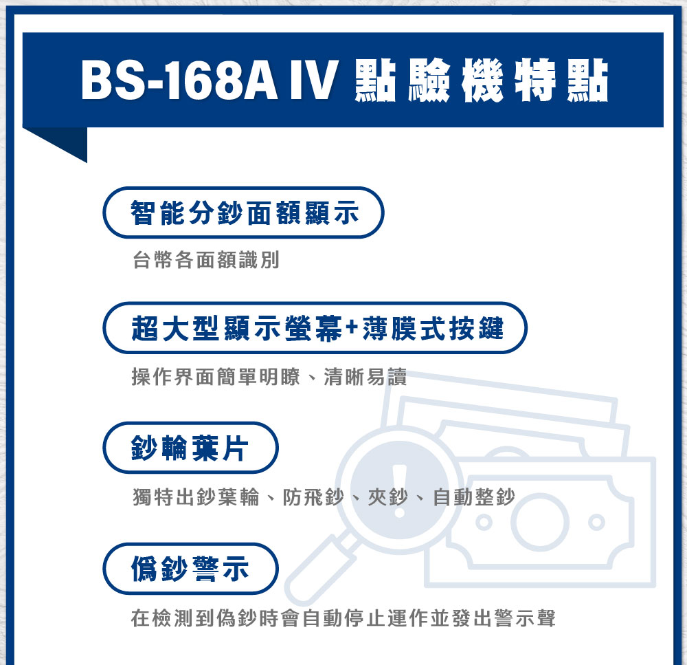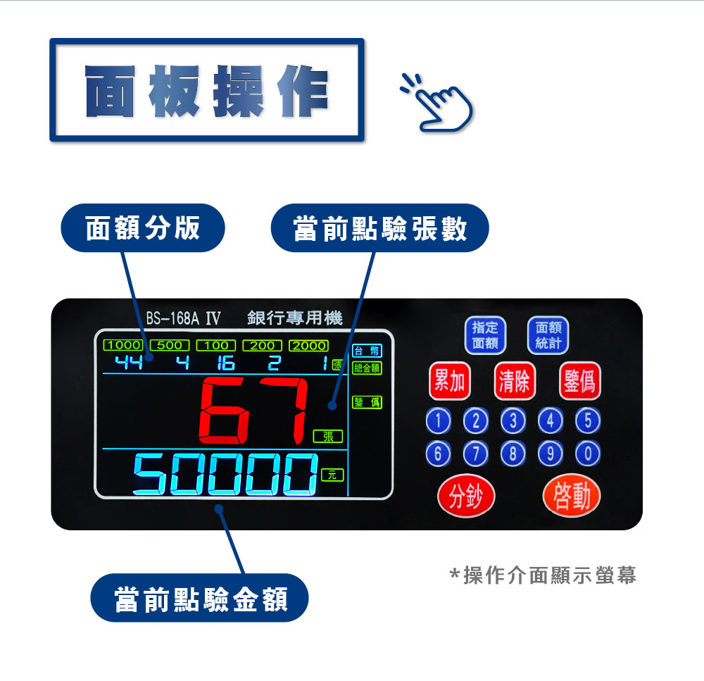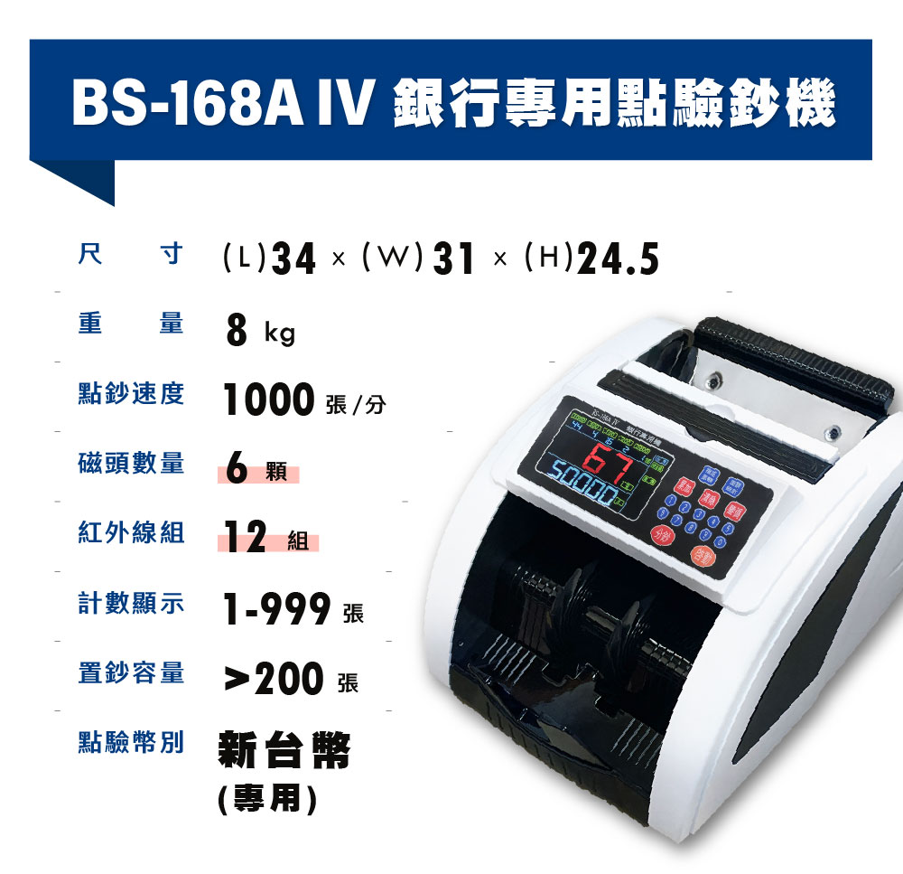 大當家BS-168A IV台幣銀行商業點驗鈔機 彩色大螢幕、各別張數顯示、分版、總計、清點、定數